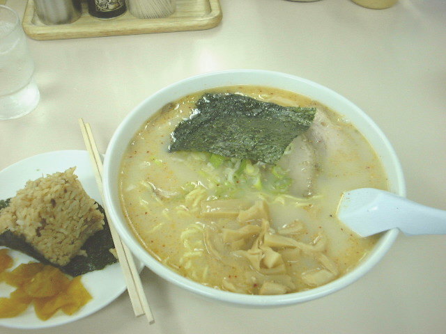 頼んだのは"とんしおラーメン"の大盛りと"おにぎり"。