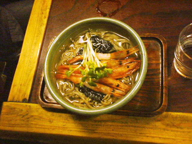 嫁さんは甘えびそば、ρ^^)はおにぎりとそばセットを注文。