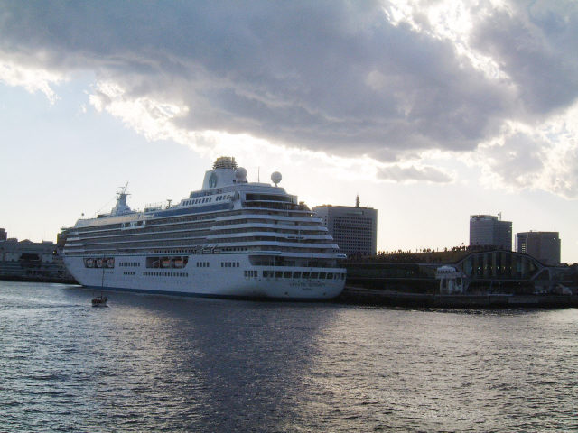 - 海のそばまで来ると大さん橋に大きな客船が停泊していました。