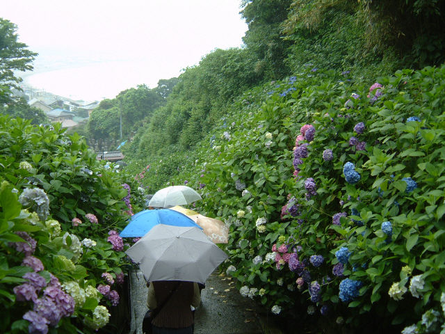 あじさいが咲いている極楽寺駅の前の坂道をてくてくと歩いていきました。 歩いていくうちに成就院への参道を見つけましたが、参道には傘の花がいっぱい(^_^;;