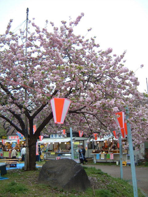 ここは八重桜のトンネルが見られるということでしたが、既に散り始めている状態で、公園内ではチャリティのカラオケ大会が行われていて