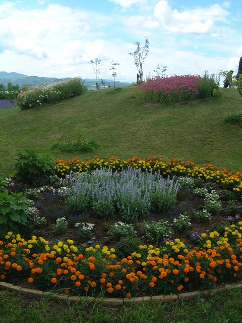 - 彩りの畑は、赤いポピーの花が間に合っていませんでしたが、その他の花は咲いており、鮮やかな模様を